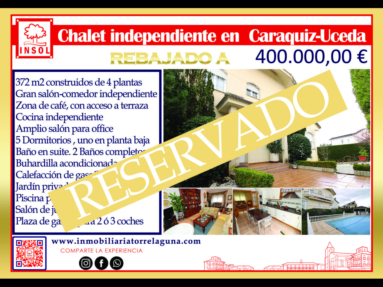 Chalet independiente, de 4 plantas, con 287 m2 construidos, sobre parcela de 1003 m2 (según Registro de la propiedad). En la planta sótano dispone de amplio garaje para 2 ó 3 vehículos y acceso a sala de juegos con bodega privada. En planta baja dispone de amplio hall de entrada. Gran salón-comedor independiente con chimenea, con zona de café y con acceso a terraza. Cocina independiente con amplio salón para office. 1 dormitorio con armarios empotrados dobles. Baño completo con plato de ducha. En primera planta dispone de 4 Dormitorios con armarios empotrados y dos de ellos con acceso a terraza. El dormitorio principal dispone de baño en suite. Disponemos de otro baño completo con plato de ducha. En la segunda planta dispone de Buhardilla acondicionada para servir como zona multiusos con dormitorio, sala de estar y cuenta con ventanas tipo velux. Ventanas de aluminio con rejas de barrotillo, puertas de madera, suelos de gres, paredes de gotelé fino, puerta blindada, calefacción de gasoil y caldera Roca. Dispone de amplio jardín privado, con gran cenador con barbacoa y piscina privada. Jardin delantero losado, jardín trasero con árboles frutales. Ubicado en Caraquiz es una zona residencial perteneciente al municipio de Uceda, conformado en su mayoría por chalets independientes y amplias avenidas ajardinadas. Disponemos de zona deportiva, lago recreativo, consultorio médico, casa cultural y otras instalaciones interesantes. Dispone de un servicio de microbus que facilita el transporte tanto en el interior de Caraquiz como el acceso a la parada del autobús interurbano.